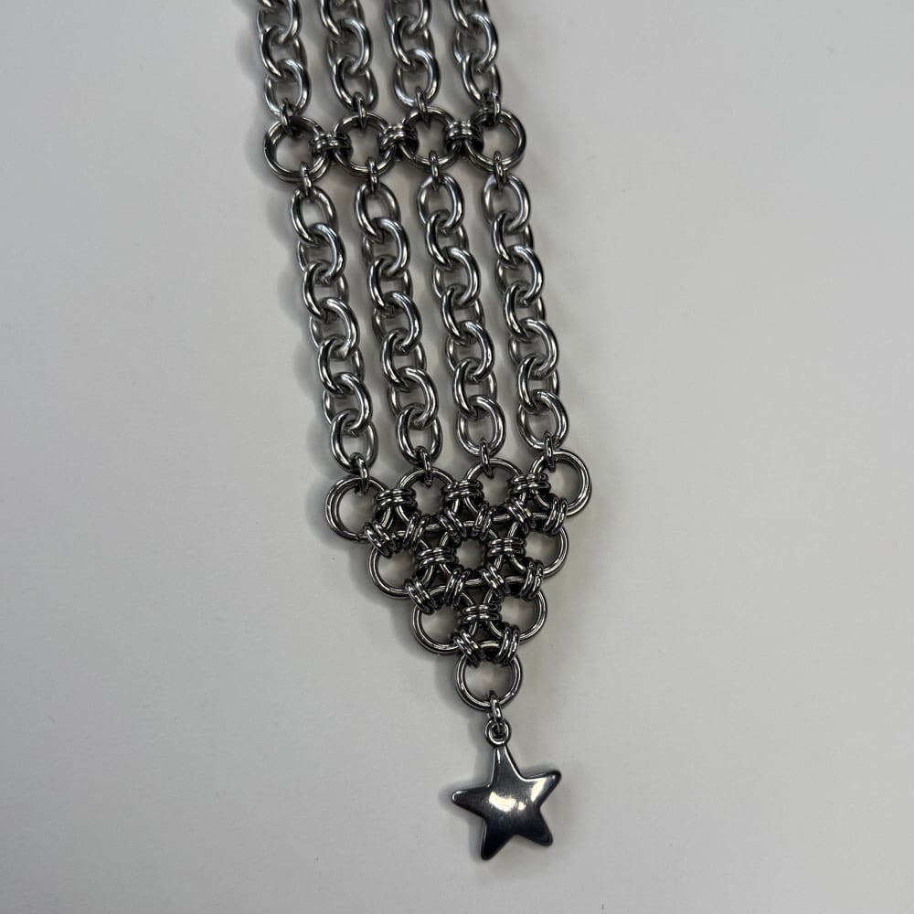 The 12 in 2 Tie is a more experimental design featuring Japanese 12 in 2 chainmaille and hanging chain - making a very unique piece of art!