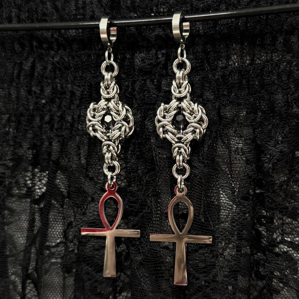 The Ankh of My Dreams earrings feature chainmaille flowers with purple faceted glass beads, and stainless steel Ankh pendants.