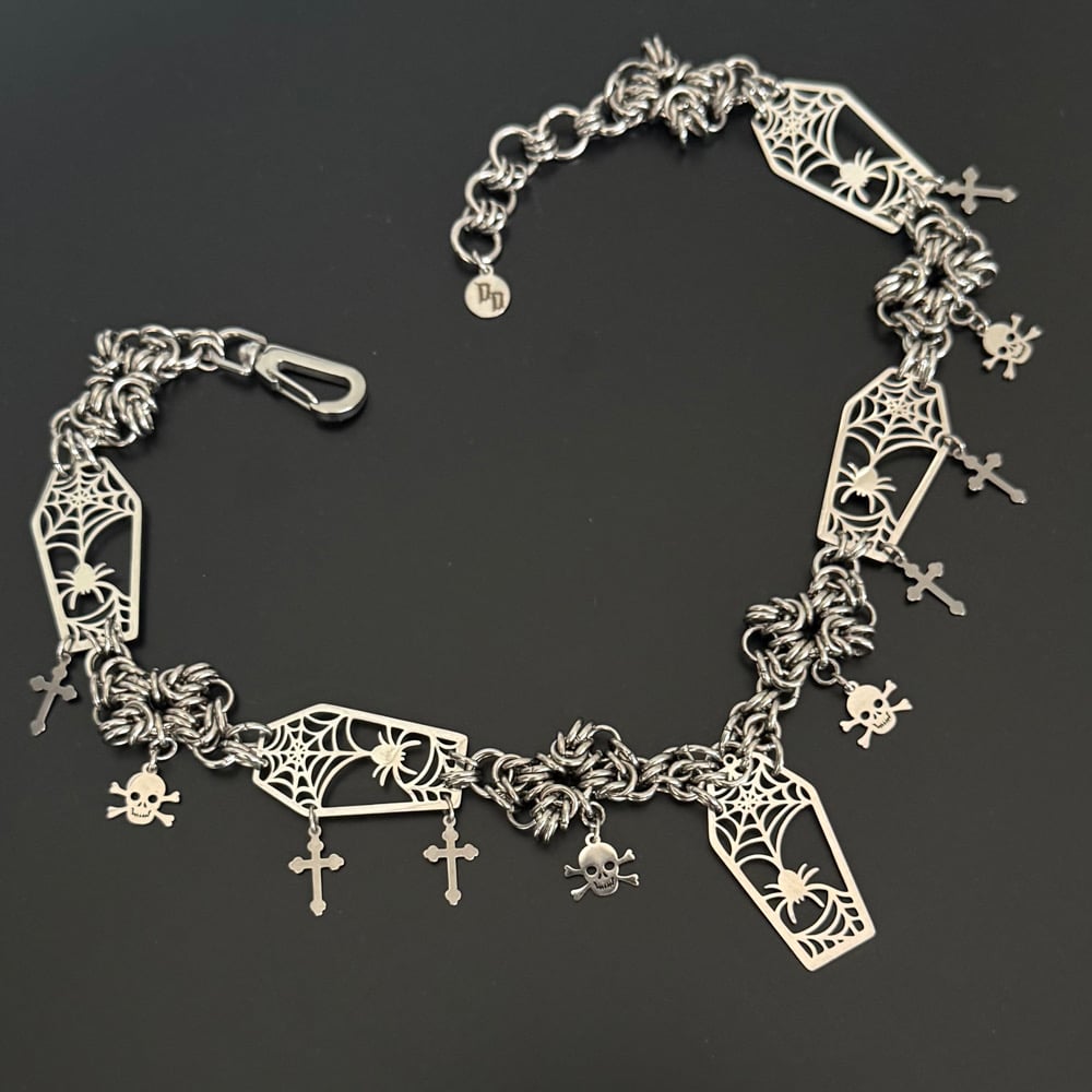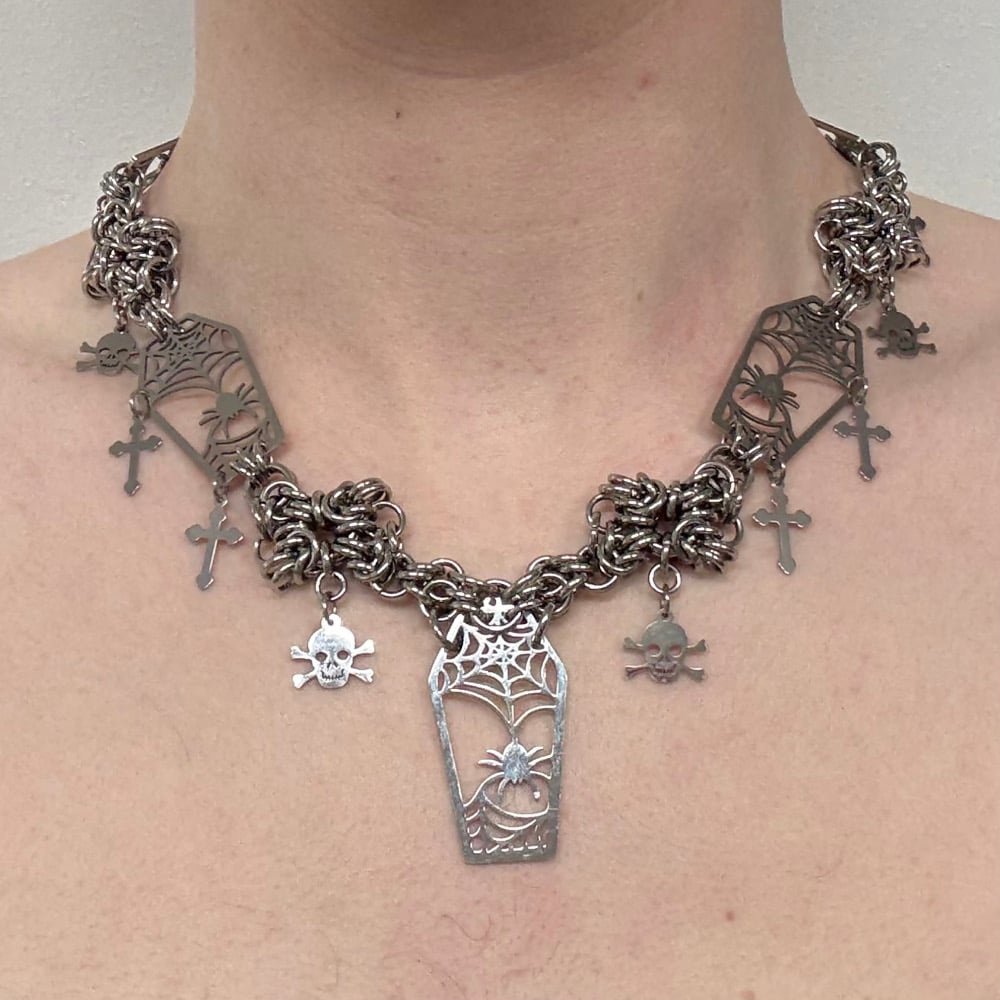 The Chained In My Coffin Necklace is a staple for any goth diva. Featuring coffins, crosses, spiders, and skulls to fit the vibe, with a unique chainmaille design to match.