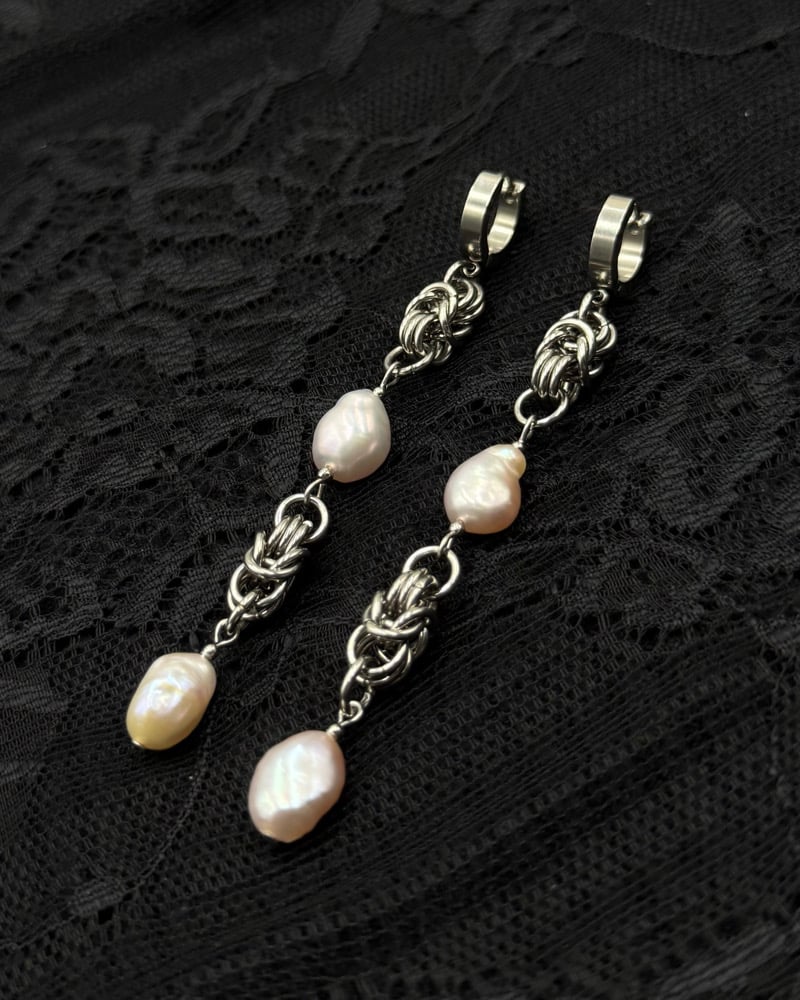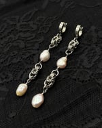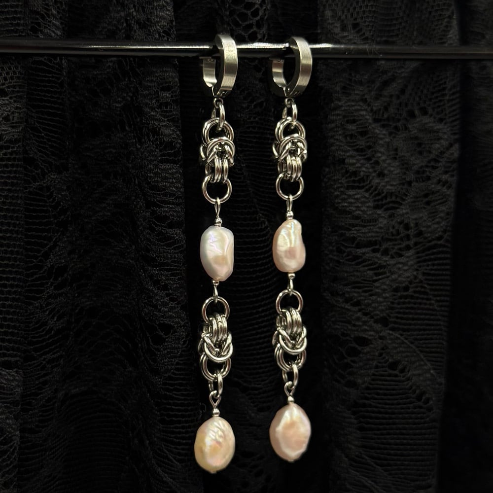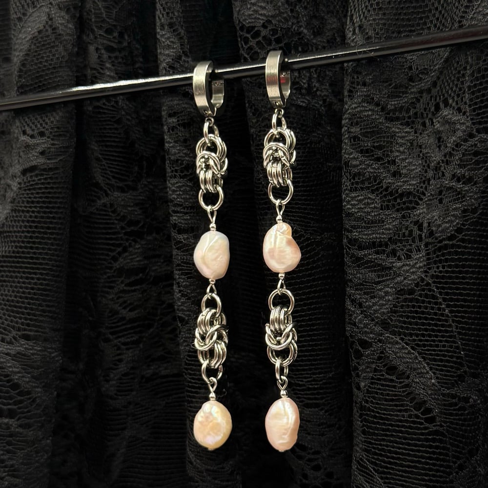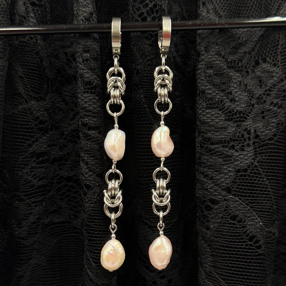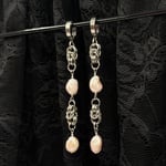 The Desire Earrings feature pink hued freshwater pearls and Byzantine chainmaille. These are simple yet elegant.
