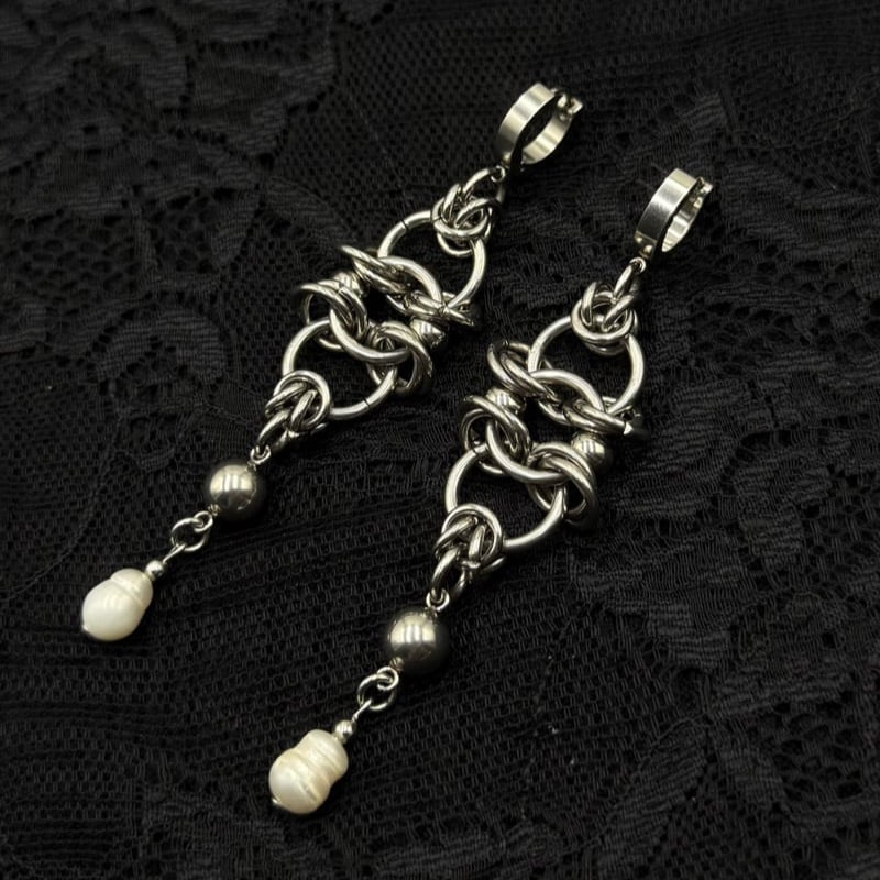 The Divine Earrings feature handmade chainmaille, ball charms, and freshwater pearls.