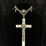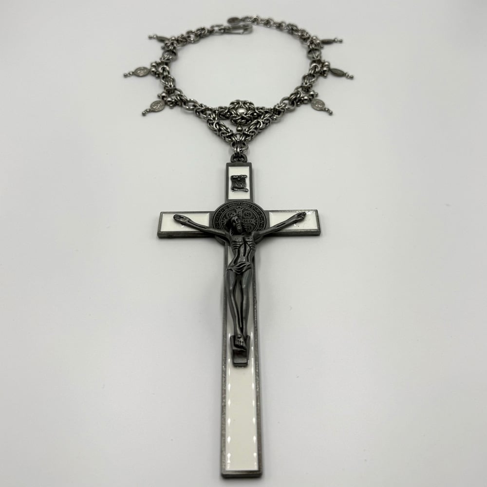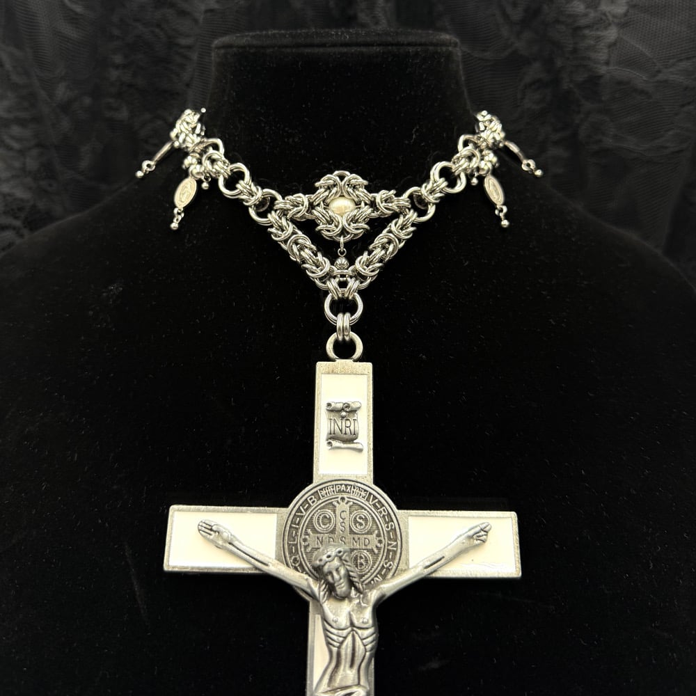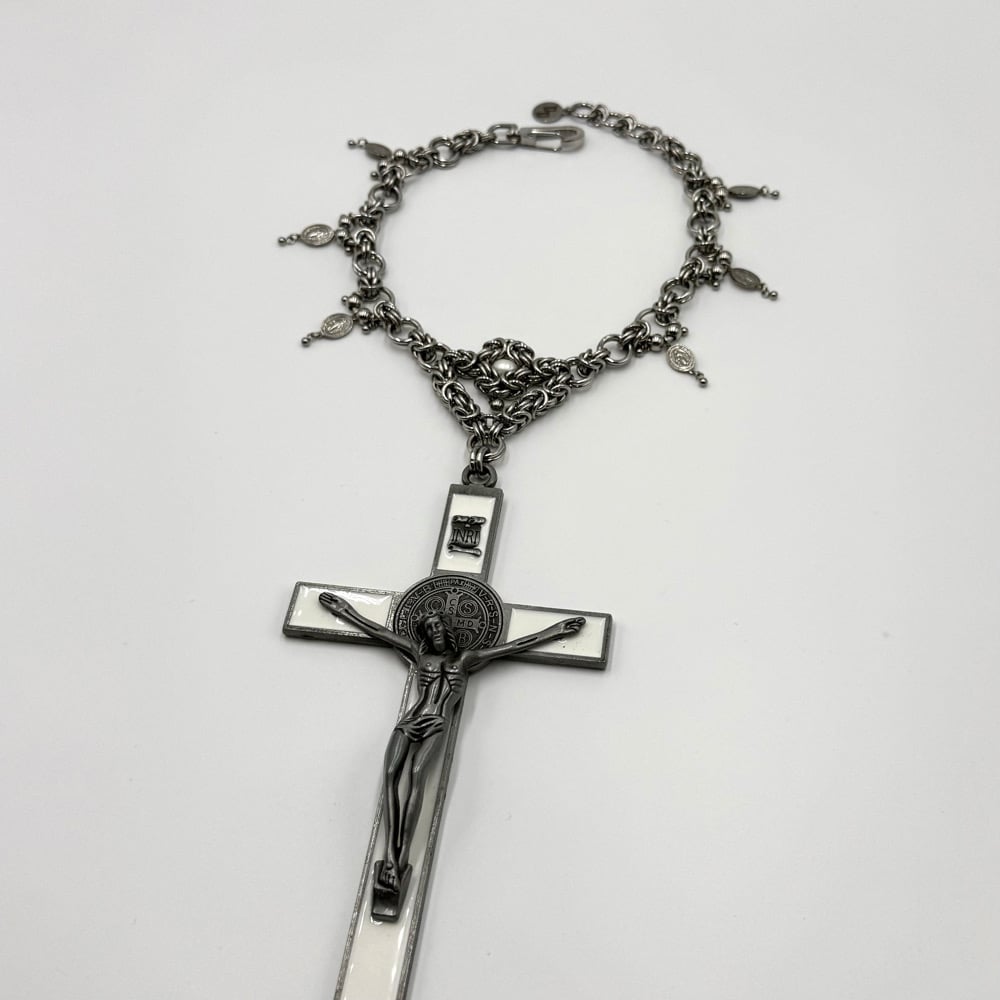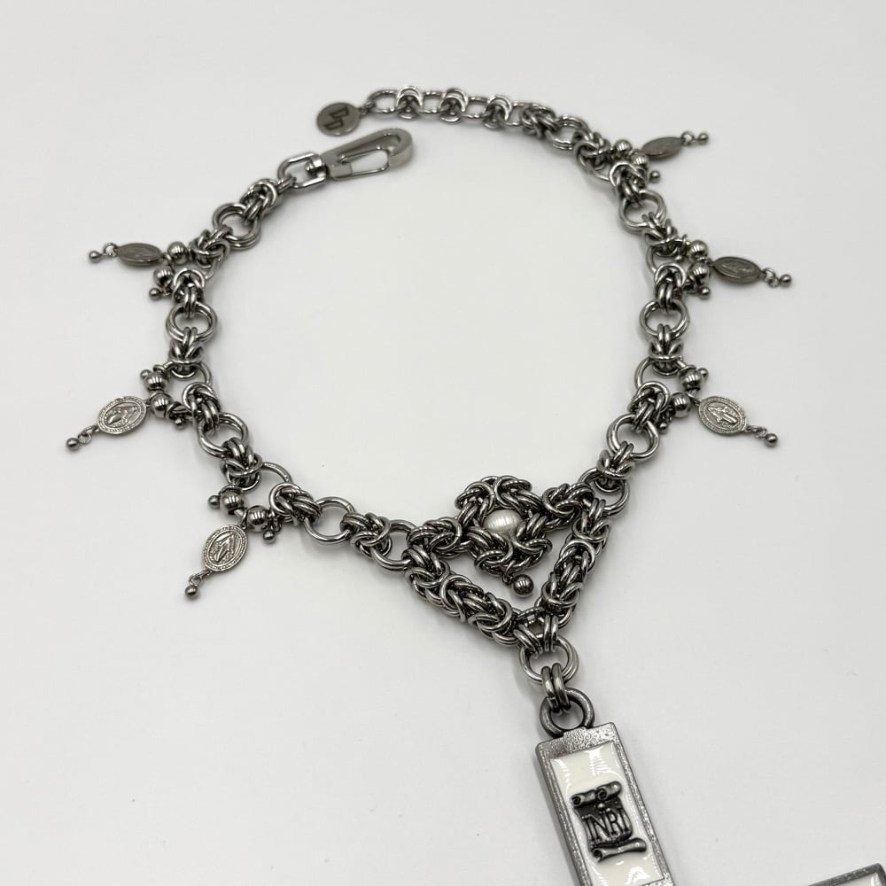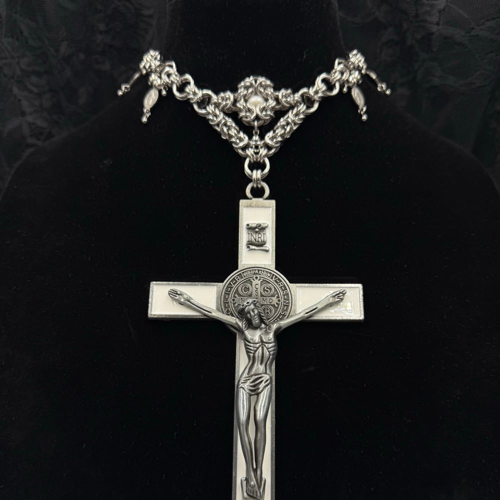 The God’s Favourite Necklace is a maximalist’s dream with a massive crucifix pendant. This necklace features religious charms, ball charms, and a freshwater pearl Byzantine centrepiece.