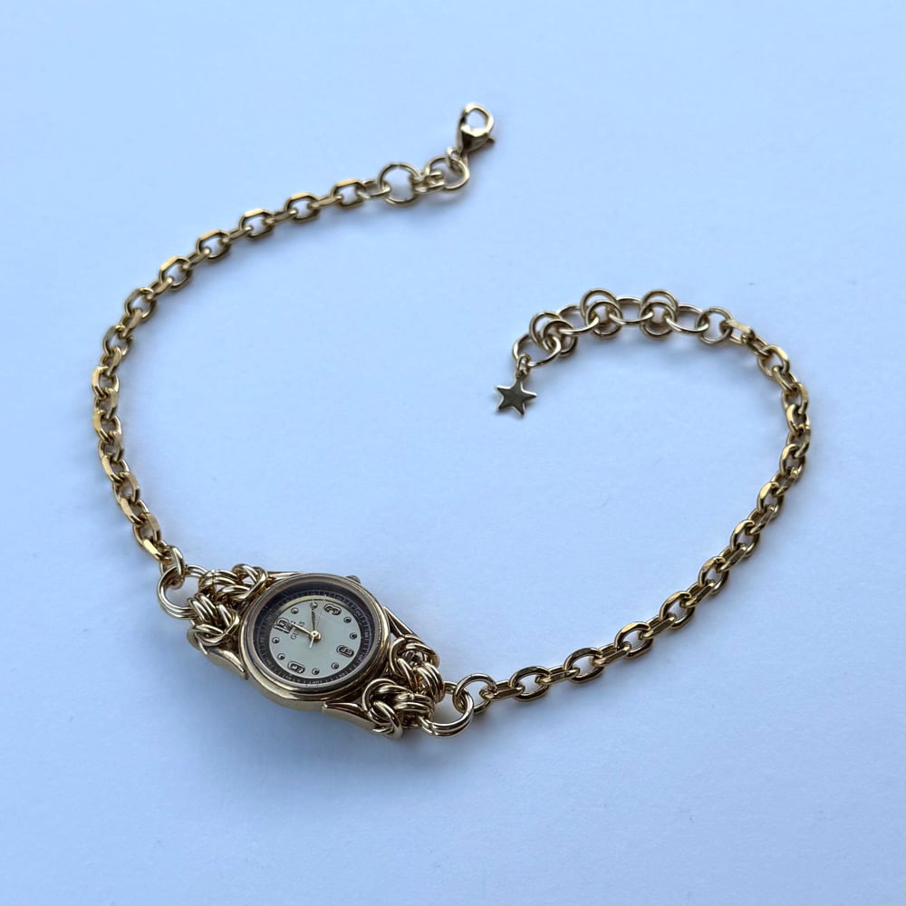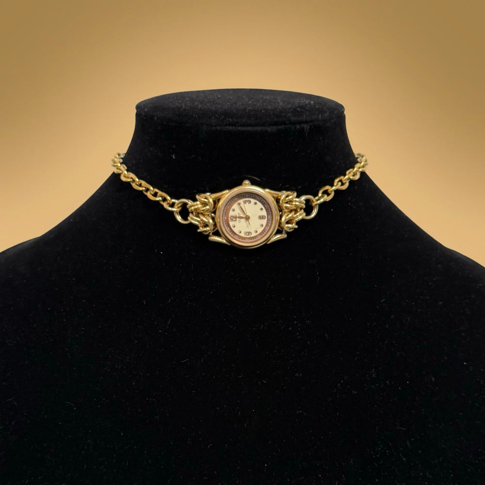 This choker features 24k gold plated stainless steel compartments, electroplated stainless steel chain and clasp, and a plated watch face. Hence, this necklace should be loved with care.