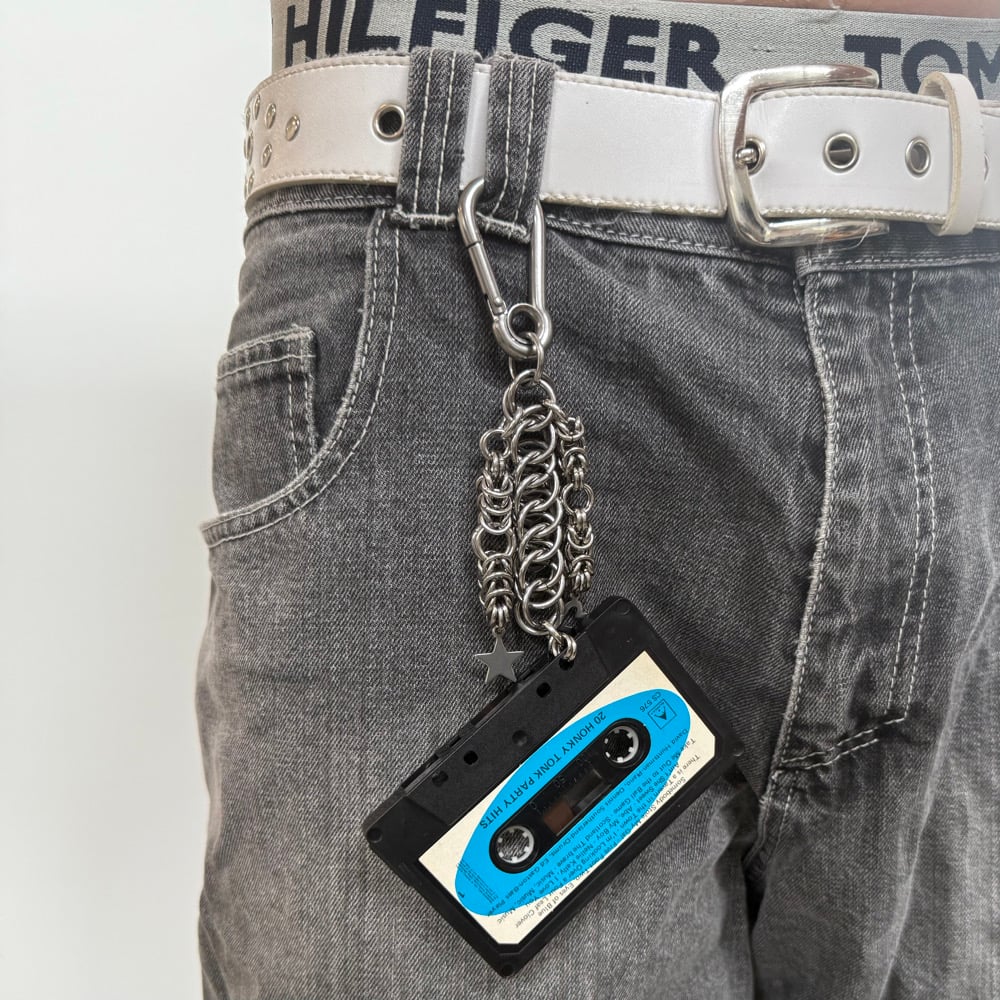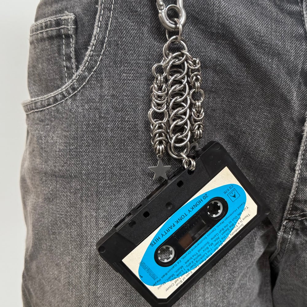The Honky Tonk Party Hits Keychain features stainless steel chainmaille and as the name suggests, a cassette tape of 20 Honky Tonk Party Hits.