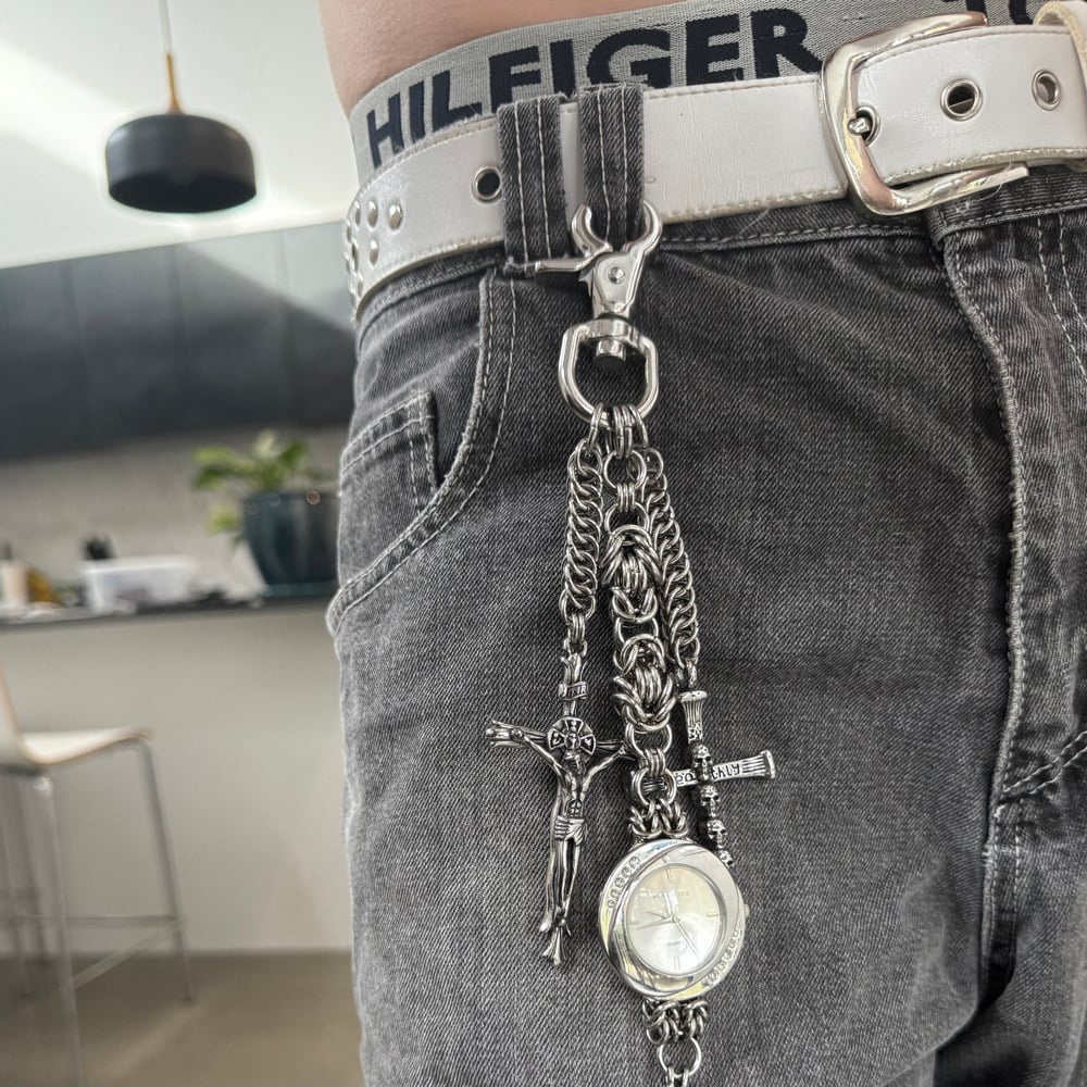 The Jesus? What’s the Time? Keychain features three stainless steel pendants, stainless steel chainmaille, and a watch face.