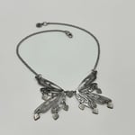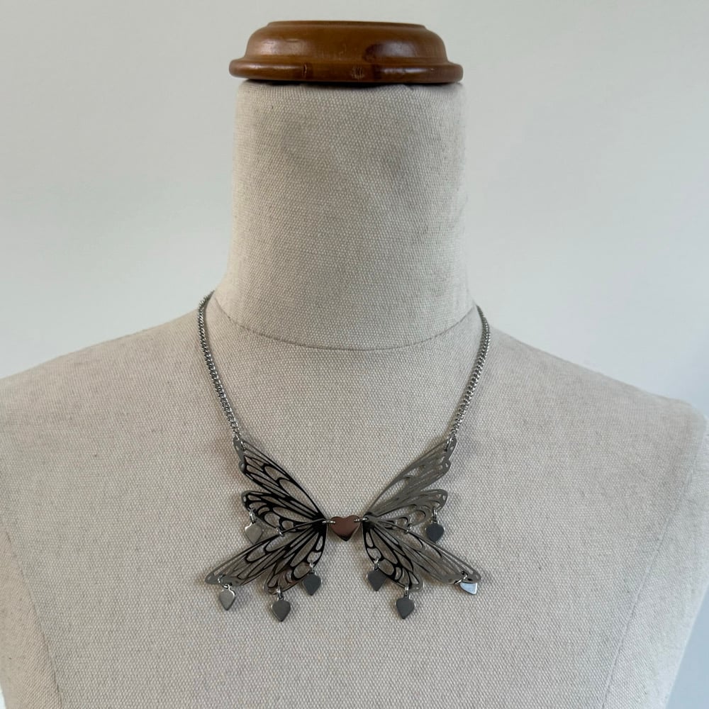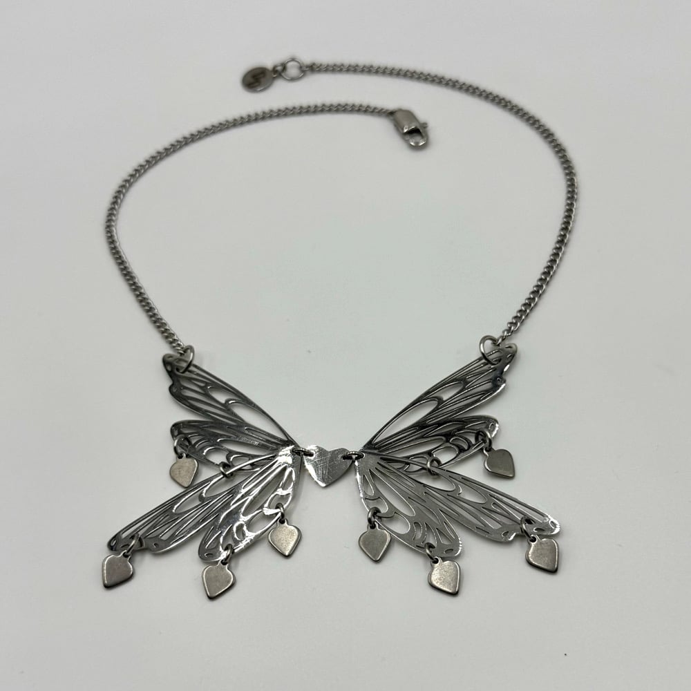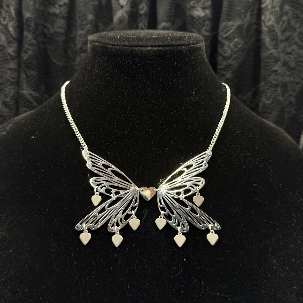 The Miss Heart Necklace is a dainty butterfly necklace adorned with heart charms and delicate curb chain.