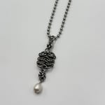 The Pearls and Dog Tags Necklace is the pair to the earrings of the same name. This piece is strung to a ball chain and features dainty chainmaille.
