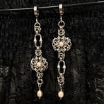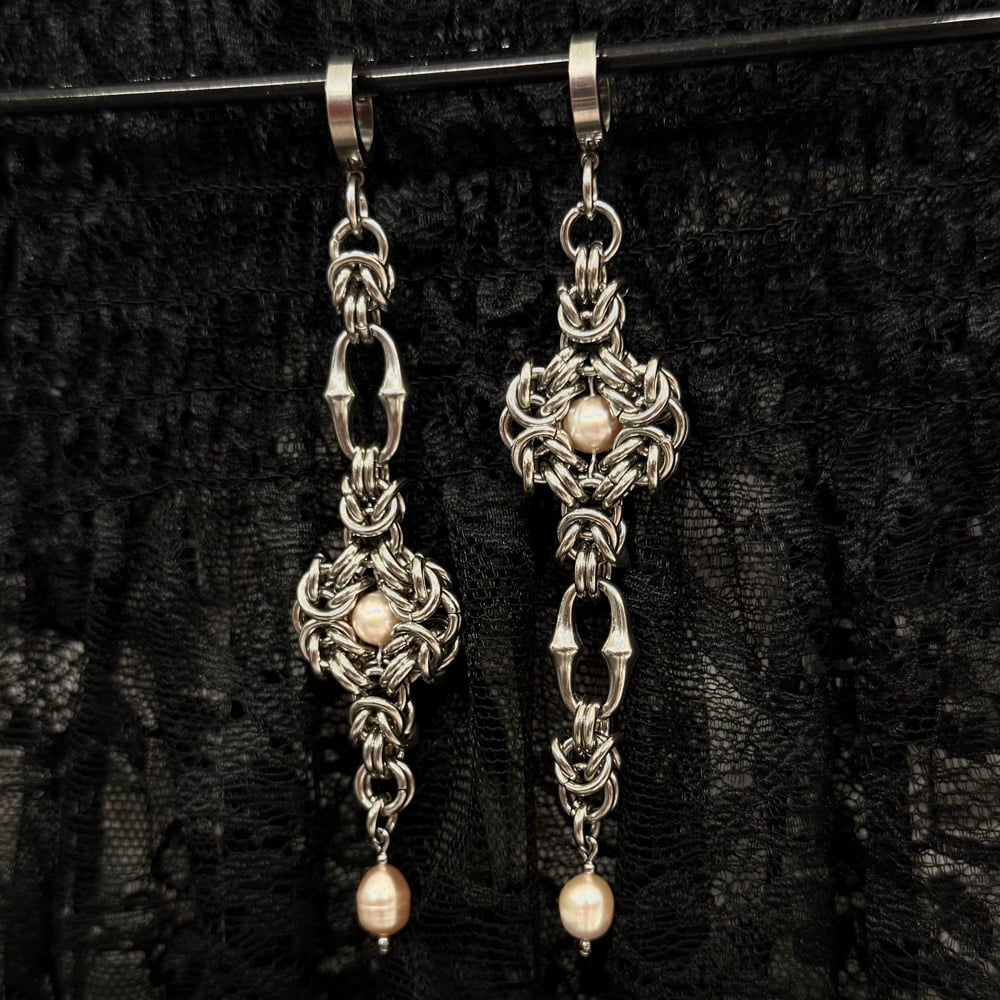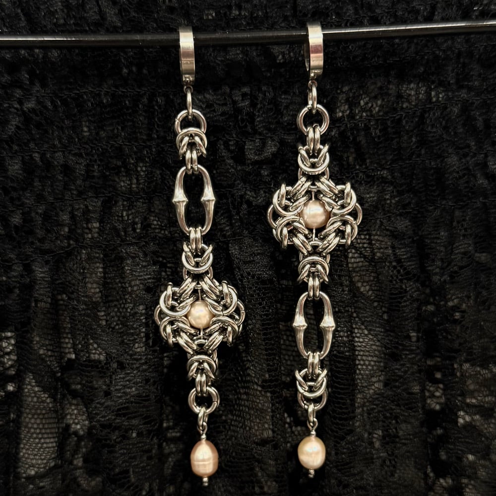 The Pinky Pearls earrings feature 100% stainless steel asymmetrical chainmaille, and pink freshwater pearls.