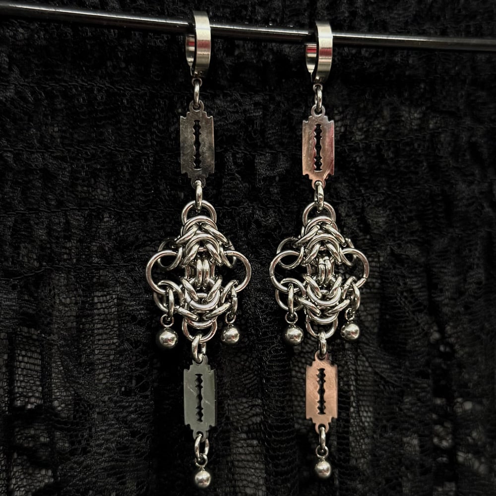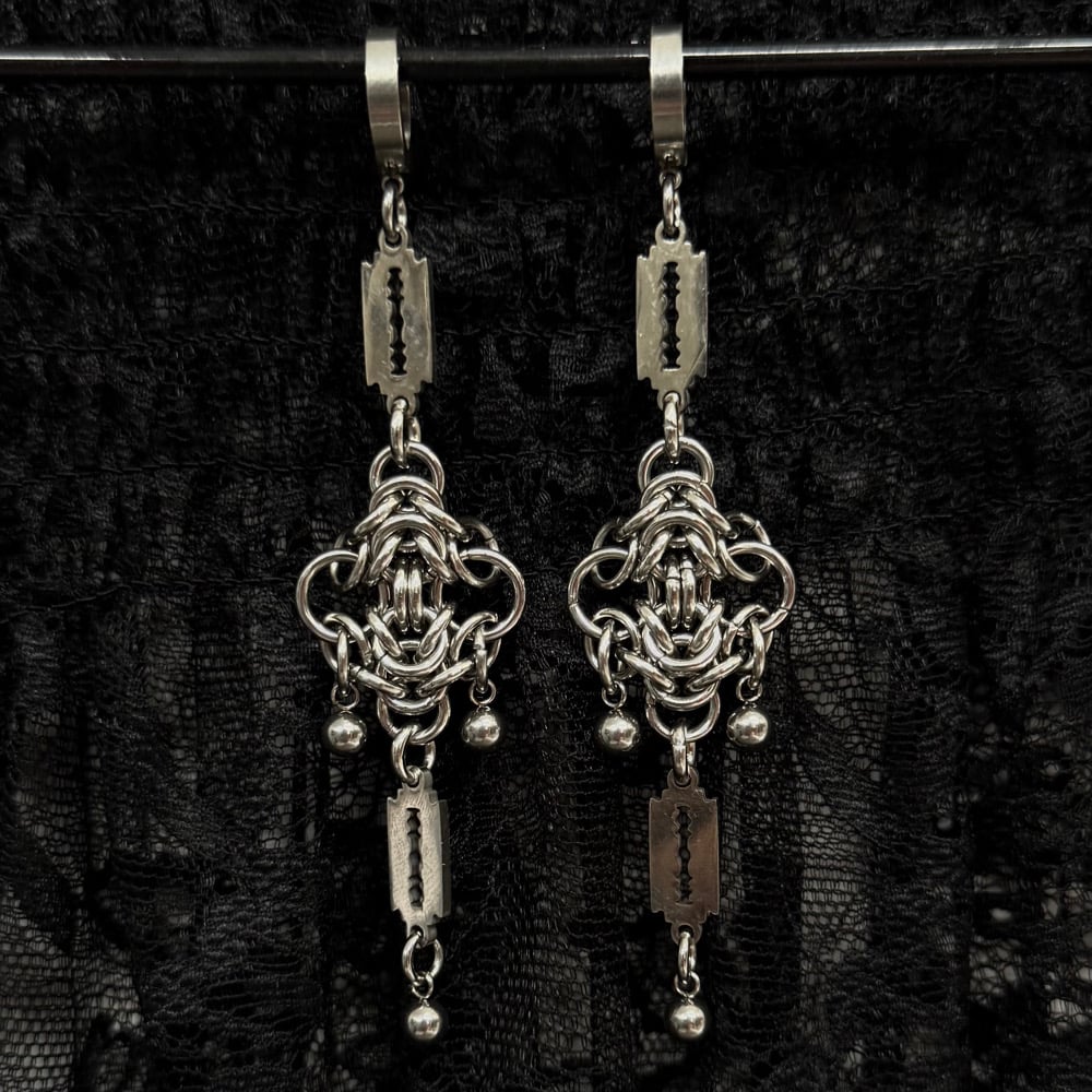 The Razor earrings are made from 100% stainless steel, and feature handmade chainmaille and razor blade charms.