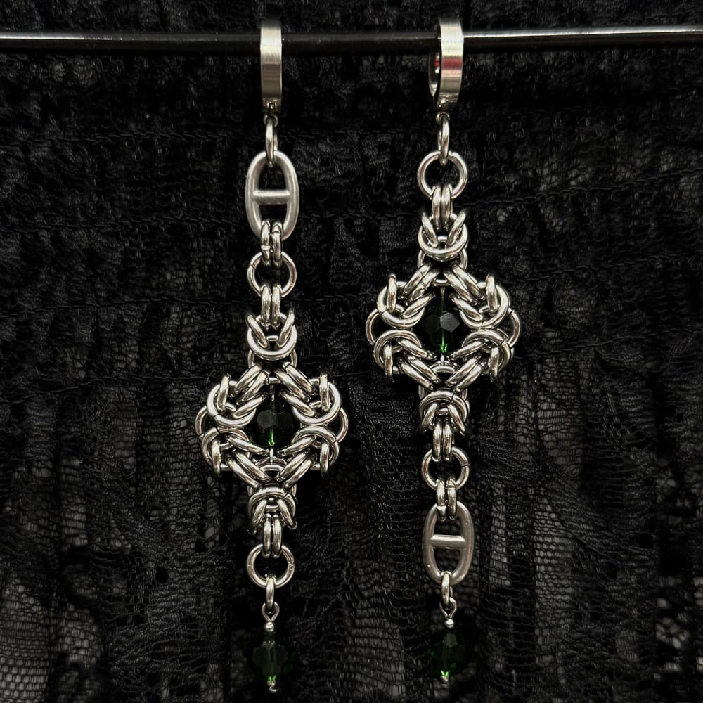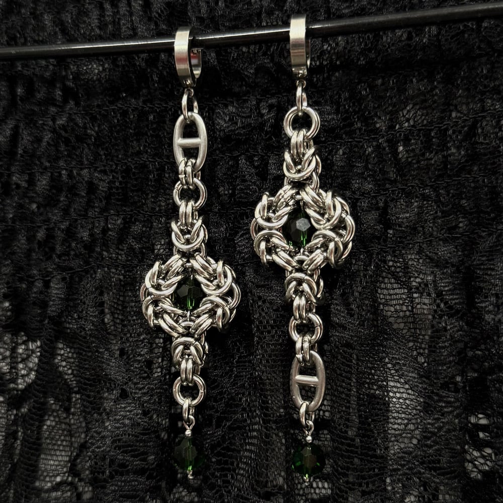 The Soda Can earrings were inspired by green soft drink cans, and are made from 100% stainless steel with green faceted glass beads.