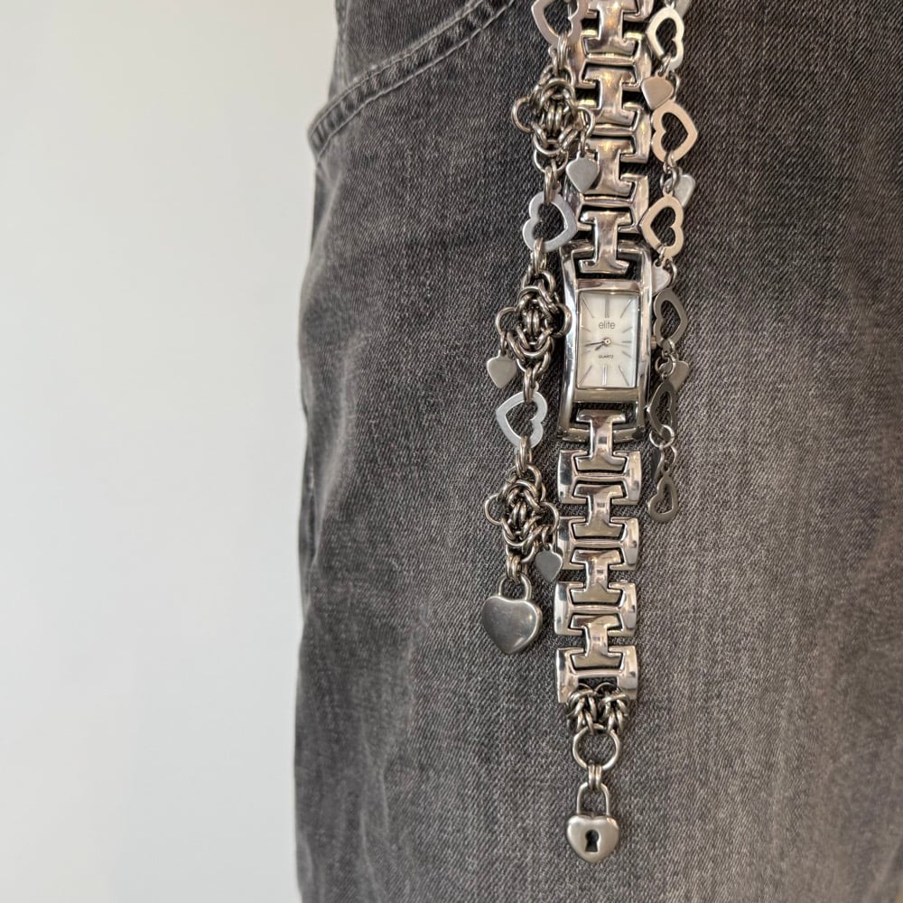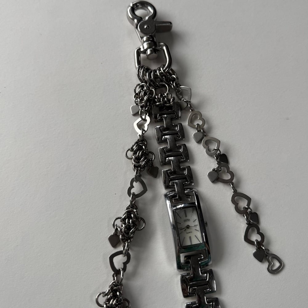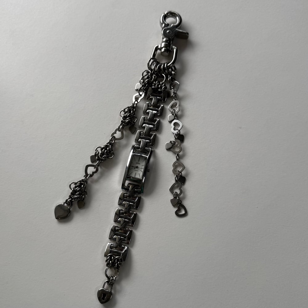 The Tangled in Hearts Keychain features a watch, stainless steel chainmaille, and hearts on hearts on hearts.