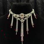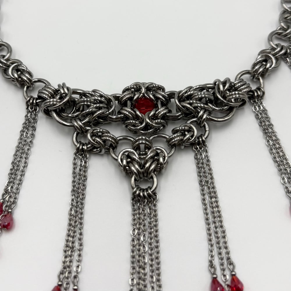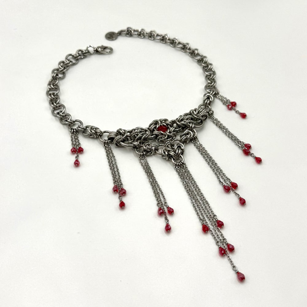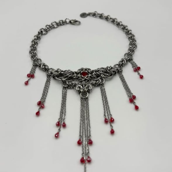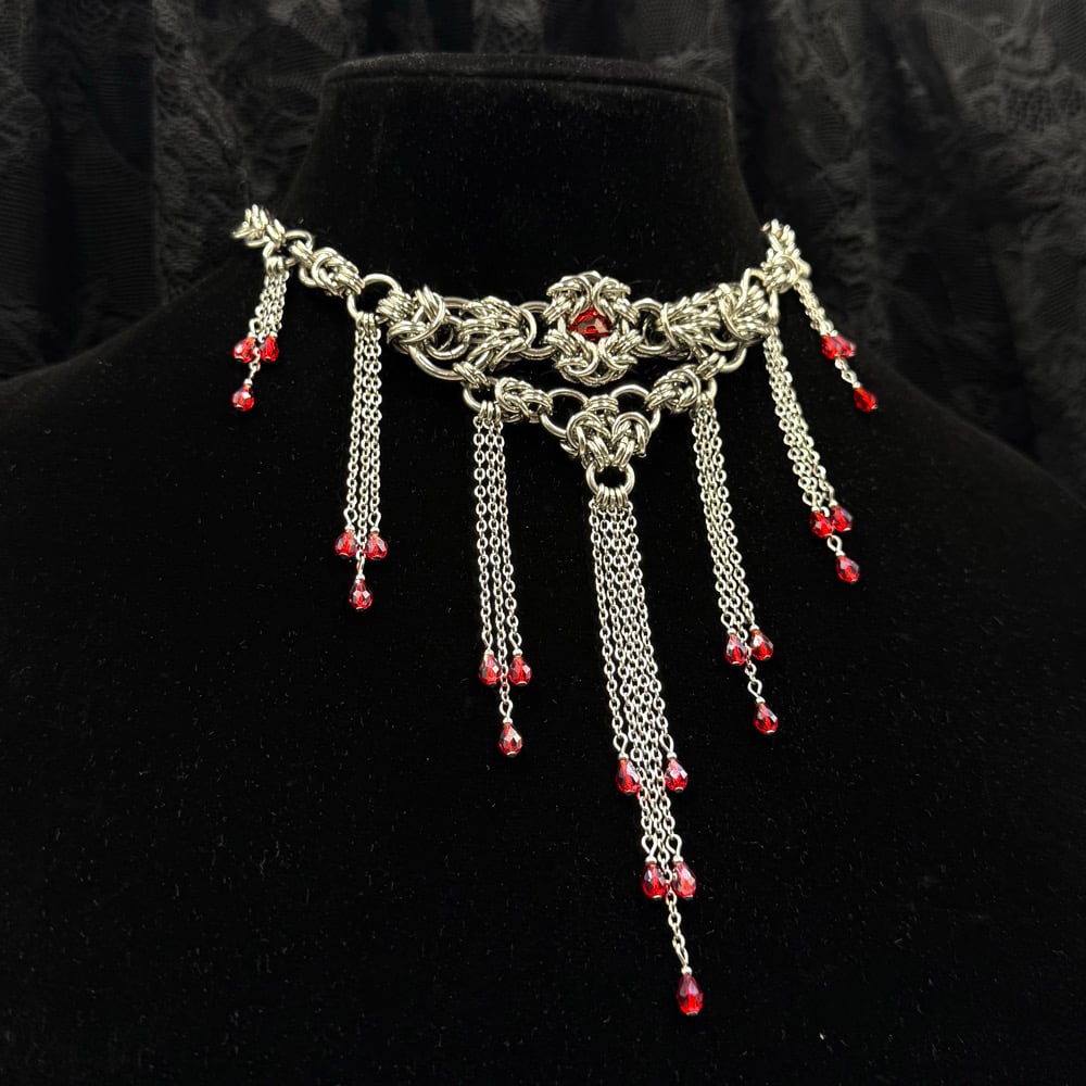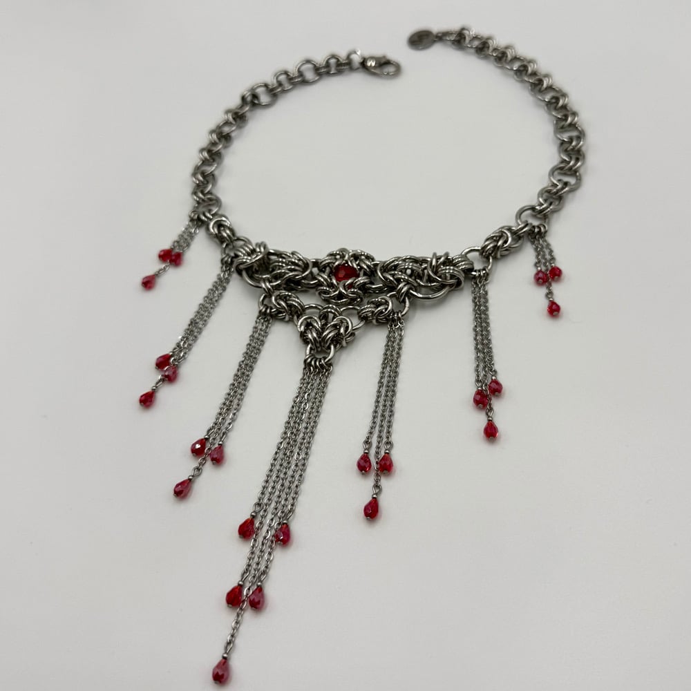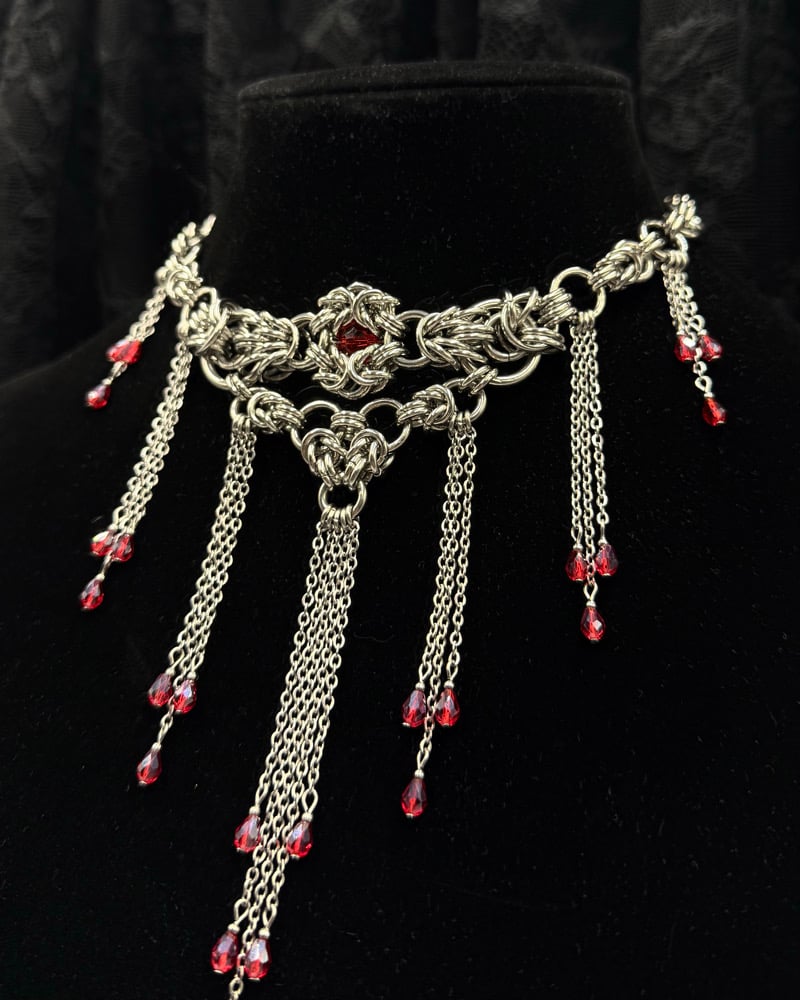 The Tears of a Vampire Necklace is a fun, experimental piece that features gorgeous dangling chains, finished with glass teardrop faceted beads.