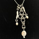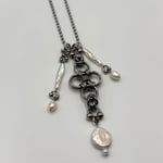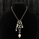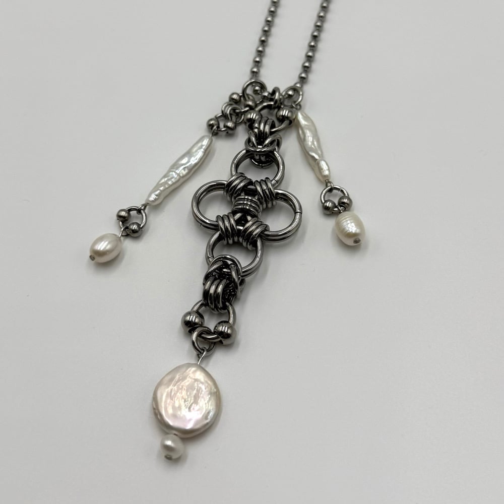 The Best Things Come in Threes Necklace is a gorgeous, eccentric piece. This piece features handmade chainmaille with baroque pearls that forms three individual strands.