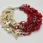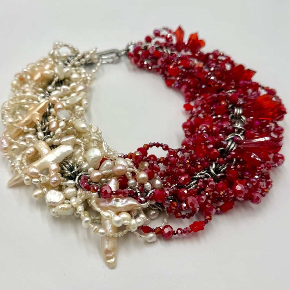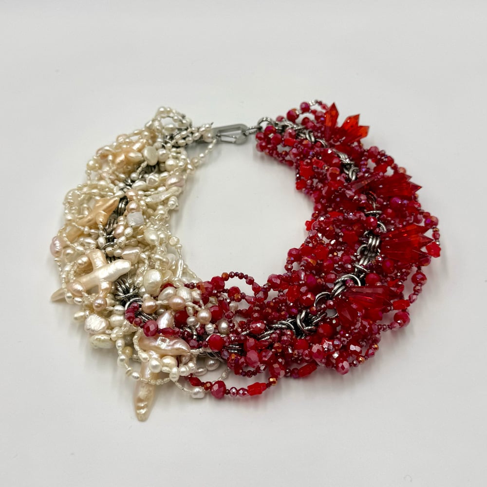 This piece features more red glass beading, and more intricate freshwater, keshi, and baroque pearls. Taking a significant amount of time to make, this necklace is a maximalists dream!