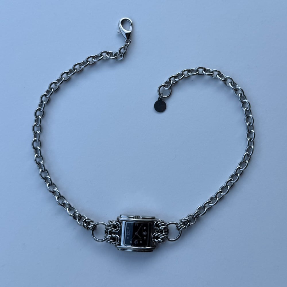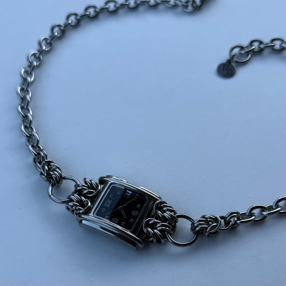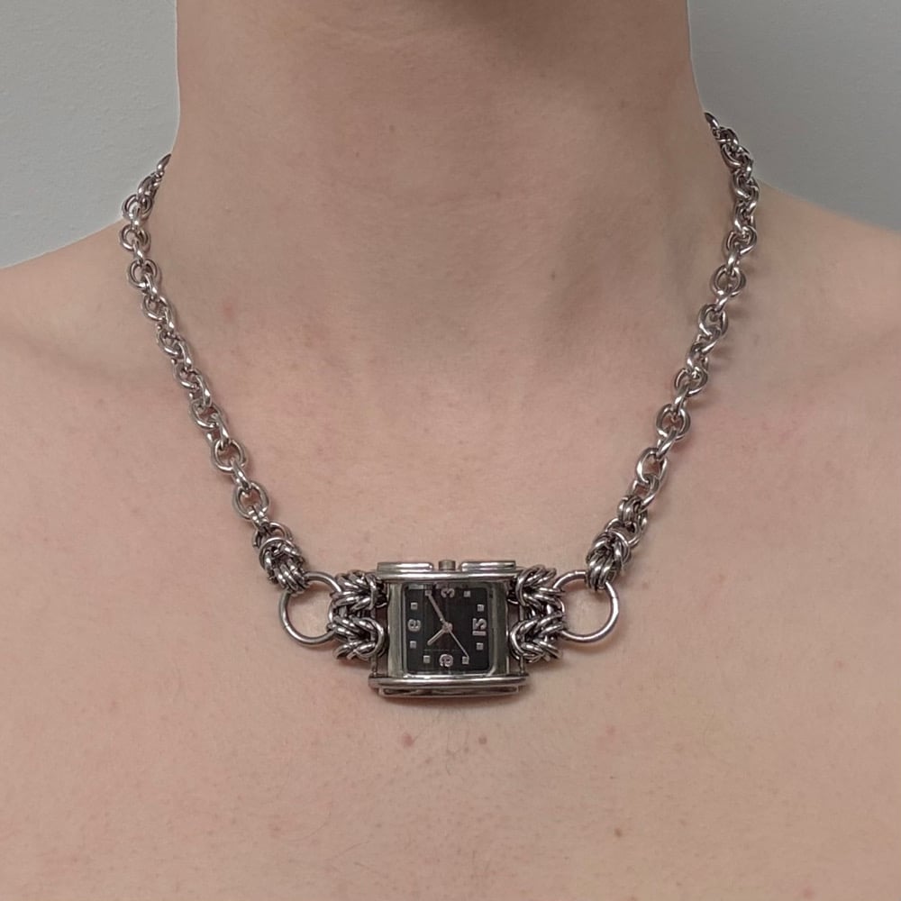 The Watch My Neck Necklace features a square watch face with some fun chainmaille, making this one of my more unique watch faces visually. The monochrome nature of this piece makes it very versatile with any outfit!