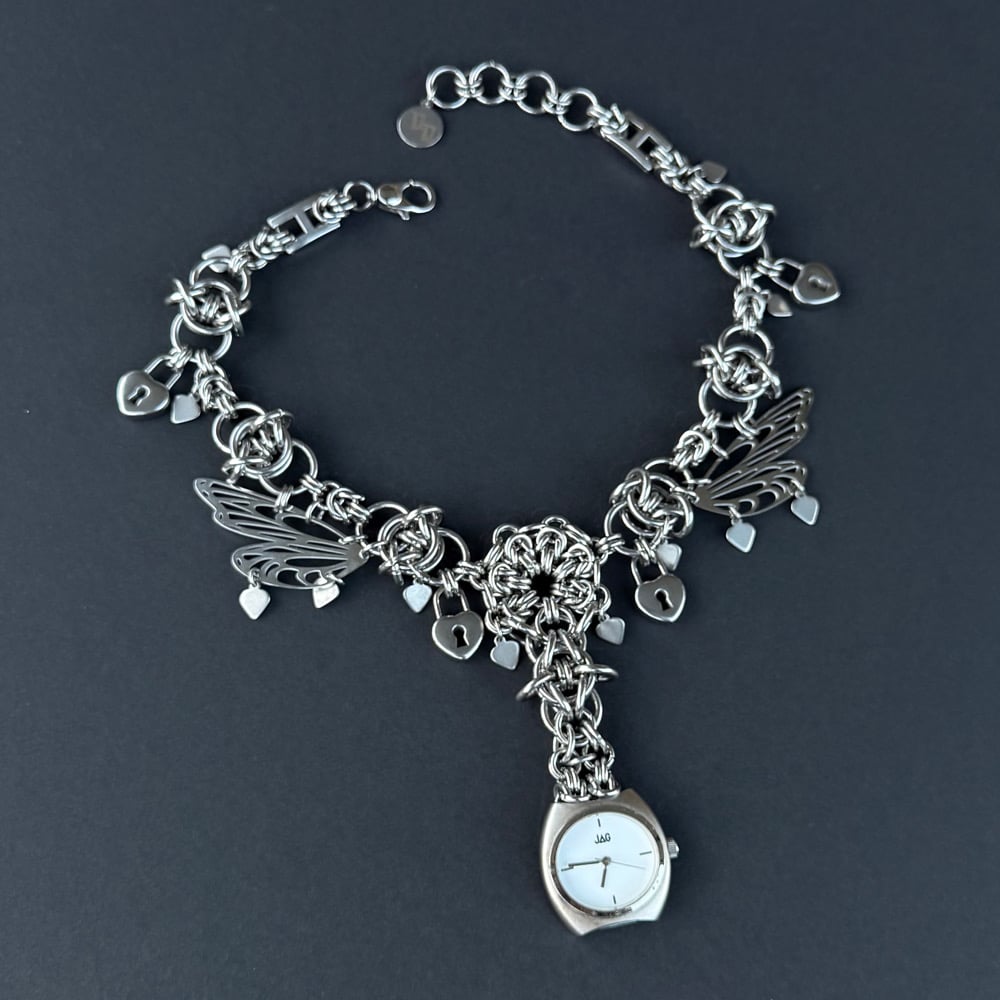 The Wonderland Necklace is inspired by Alice in Wonderland, yet simultaneously the structure of a rosary - where instead of a cross, she bears a watch pendant.